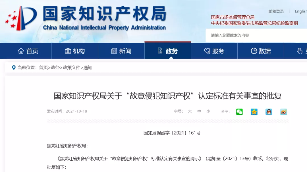《黑龙江省知识产权局关于“故意侵犯知识产权”标准认定有关事宜的请示》(黑知呈〔2021〕13号)收悉。经研究,现批复如下: